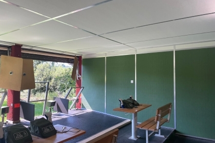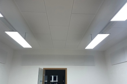 In diversen Räumen wurden die Decken und Wände mit Soni Protect Melaminschaumstoffplatten verkleidet. In den Räumlichkeiten kann nun mit einer guten Raumakustik gearbeiten werden.