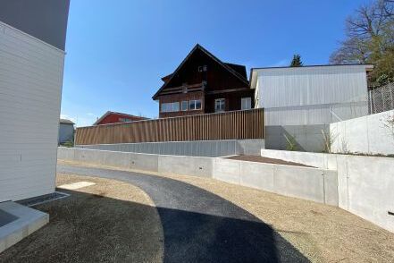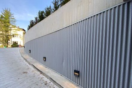 Beim Neubau eines Mehrfamilienhaus wurde die Garageneinfahrt mit einem Vorsatzschalenelement aus Aluminium verkleidet. Damit die Nachbarschaft noch mehr vom Lärm abgeschirmt sind, wurde noch zusätzlich eine Lärmschutzwand aus Holz erstellt.