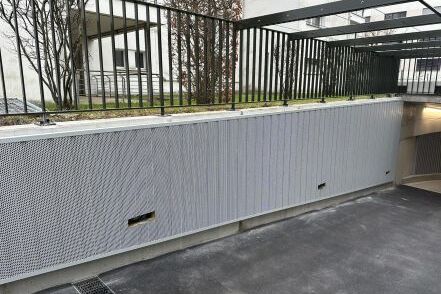 Bei der neu erstellten Wohnüberbauung konnten wir mit unseren Elementen aus Aluminium die Einfaht in die Einstellhalle schalltechnisch optimieren. Zum angrenzenden Grundstück wurde zusätzlich eine Lärmschutzwand aus Aluminium errichtet.