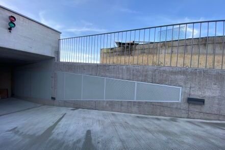 Beim Neubau einer Wohnüberbauung konnten wir mit unseren Elementen aus Aluminium die Einfaht in die Einstellhalle schalltechnisch optimieren. Durch die ausgewählte Farbe passt die Verkleidung optimal ins Farbkonzept des Architekten.